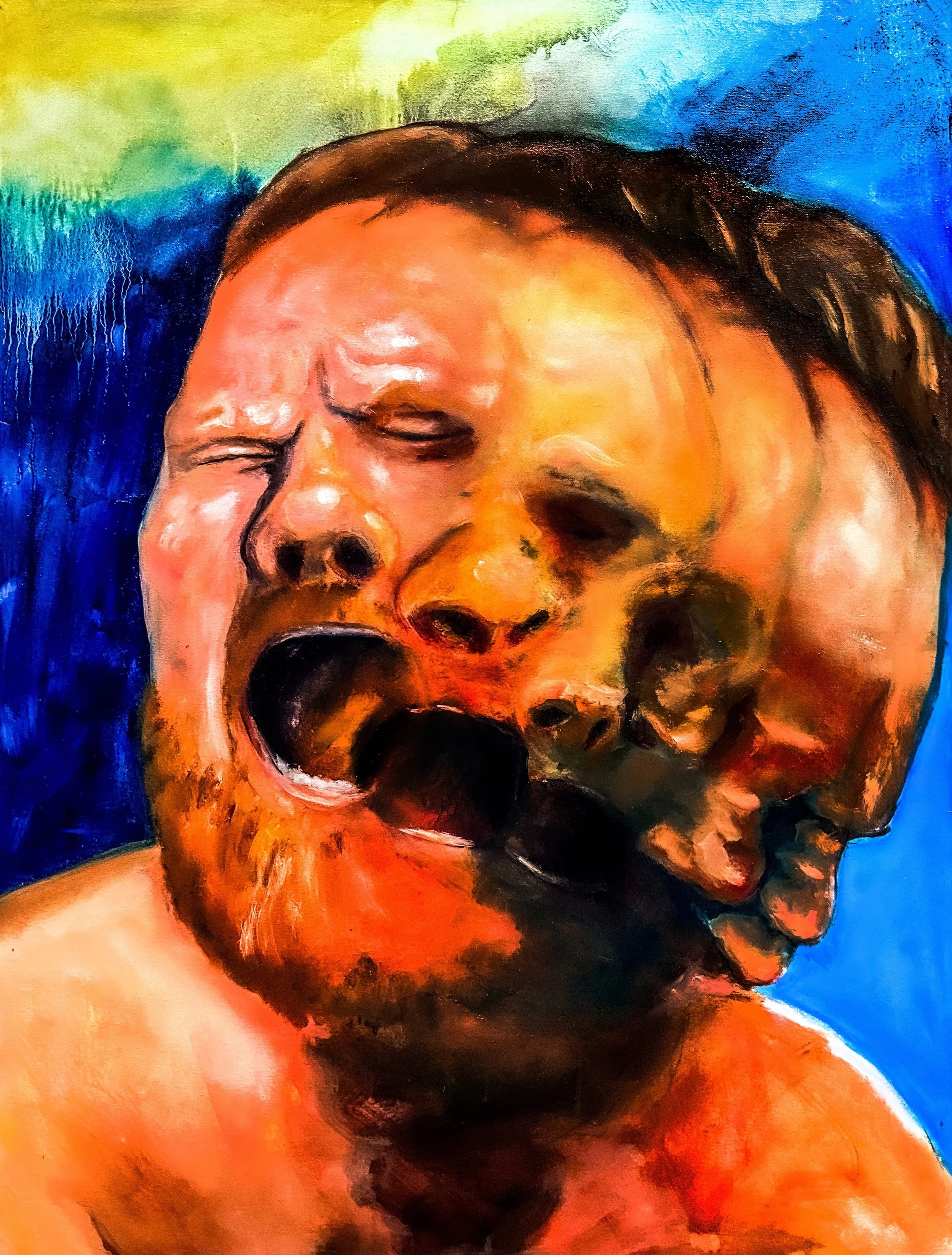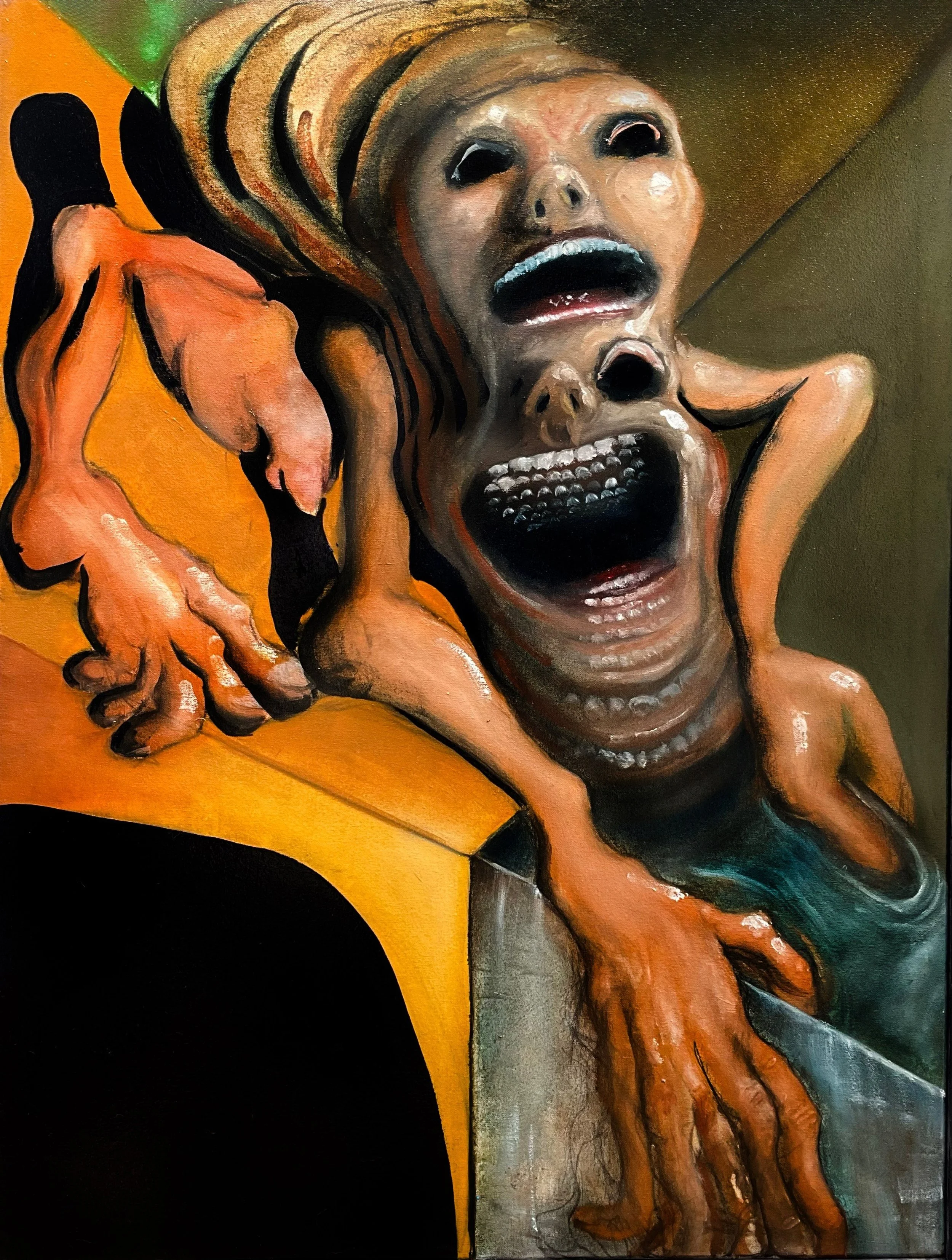 Drawing from the uncanny valley effect, Muhl paints fragmented, human-like body parts caught in moments of visceral entwinement. The forms writhe, push, and penetrate one another in ways that obscure their identity as human, abstracting them to a point where recognition teeters on the edge of ambiguity. This intentional distortion immerses the viewer in a space where the familiar becomes foreign, evoking both unease and fascination.